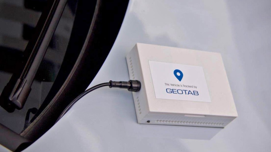 von 6: Das Geotab-Kästchen ähnelt dem von Deus Pollutrack und wird ebenfalls auf dem Fahrzeug angebracht, hier auf der Motorhaube eines Skoda Scala.