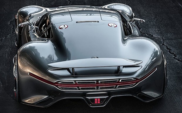 von 5: Im zerklüfteten Heck der Vision Gran Turismo mit großem Spoiler, aber ohne Heckfenster, sitzen in zwei Reihen übereinander acht Auspuffrohre.