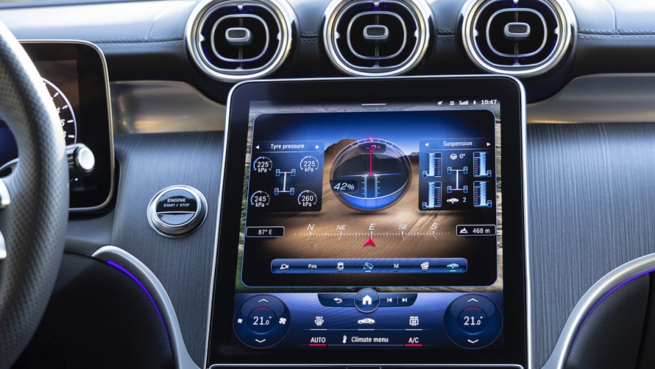 von 7: Das Ambiente im Innenraum gleicht dem der C-Klasse, geprägt durch das Tablet-ähnliche Zentraldisplay und das breite Anzeigefeld hinterm Lenkrad.