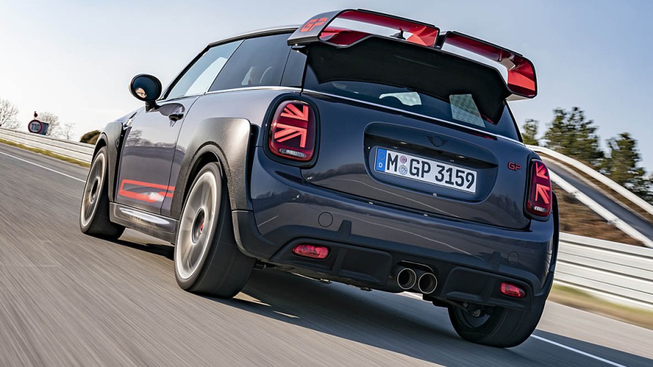 von 9: Wo die meisten anderen Autos bei 250 km/h abgeriegelt sind, stürmt er als schnellster Straßen-Mini aller Zeiten mit bis zu 265 km/h über die linke Spur.