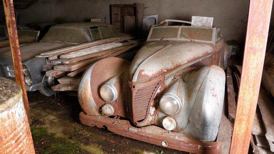 von 7: Die Autos waren in Unterständen untergebracht (mittig ein Facel Vega Excellence, hinten ein Talbot Lago T26 Cabriolet Saoutchik), die die Fahrzeuge mehr oder weniger gut schützten.