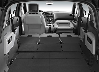 von 10: Die beiden hinteren Sitze lassen sich im Wagenboden versenken, die drei Sessel in der zweiten Reihe können um bis zu 13 Zentimeter verschoben werden und lassen sich ebenfalls umklappen.