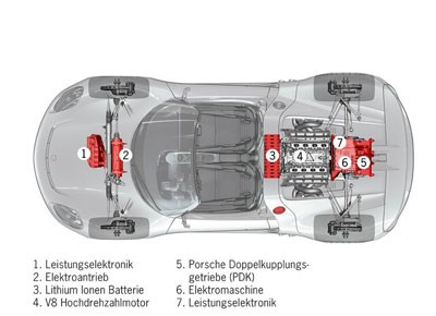 von 9: Porsche kombiniert unter der Haube des Prototypen ein V8-Triebwerk mit einer Leistung von mehr als 500 PS und drei insgesamt 217 PS starken Elektromotoren.