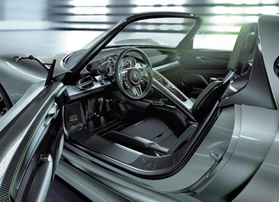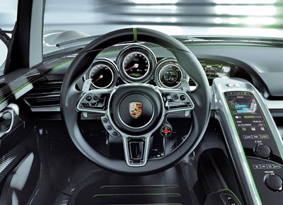 von 9: Fahrer und Beifahrer sitzen in einem Cockpit, dessen Synthese aus effizienter Funktion und ergonomischer Hightech-Bedienung einen Ausblick auf künftig mögliche Innenarchitekturen bei Supersportwagen geben soll, so Porsche.