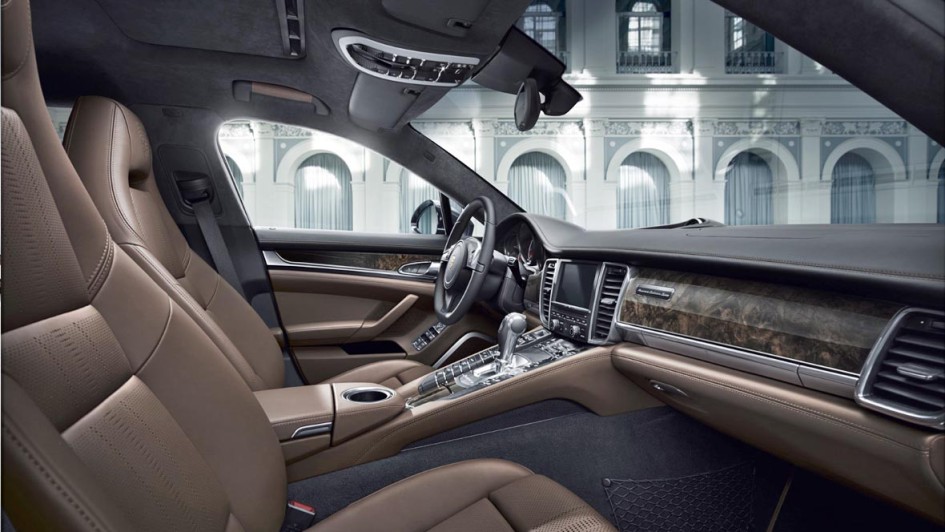 von 5: Im Innenraum, wo Wurzelholz in Klavierlack ausläuft, gibt es maronenbraunes und schwarzes Leder, und Sitzmittelbahnen mit ein-perforiertem Porsche-Wappen.