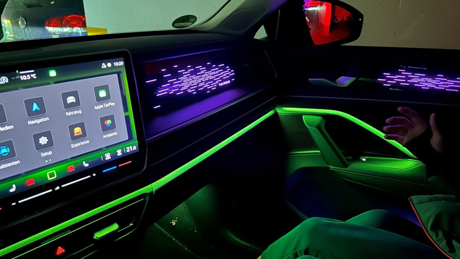 von 12: Optisch reiht sich der Tayron zwischen Tiguan und Touareg ein. Das Leuchtenband mit Logo ist ein Blickfang. Eine neue Optik bieten auch die Radkästen des Tayron, sie sind eckiger und damit markanter ausgeformt als beim kleinen Bruder Tiguan.