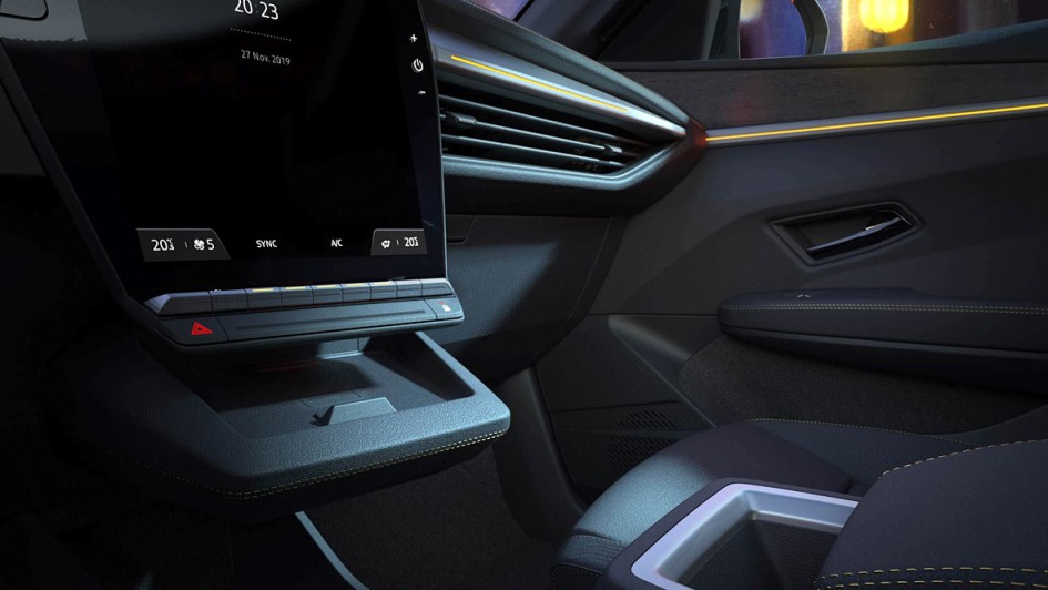 von 4: Renault zeigt erste Detailaufnahmen vom 2022 erwarteten Mégane E-Tech Electric.Innovative Bordsysteme und neue Bildschirme prägen das Innenraum-Ambiente.