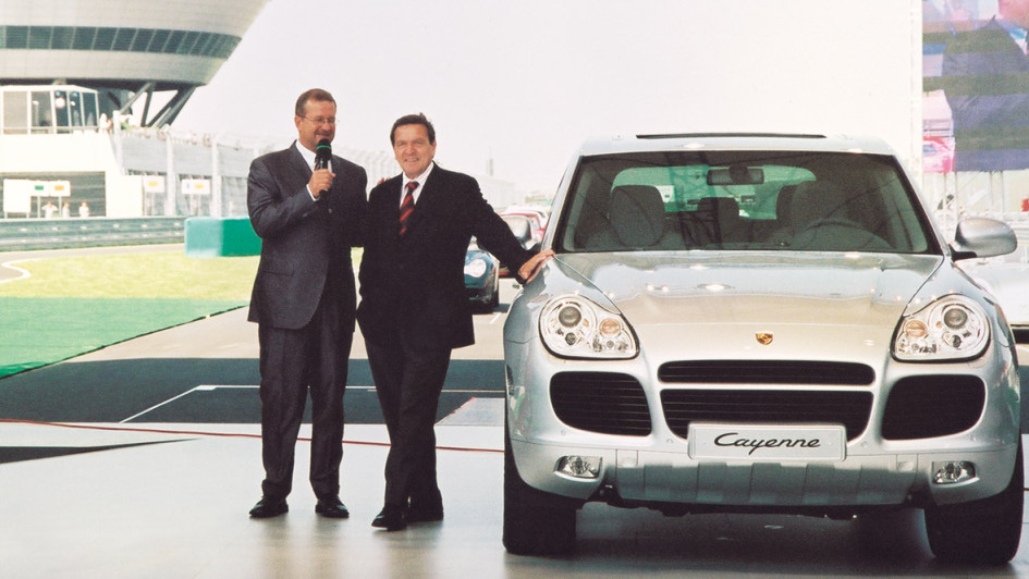 von 10: Der Bau eines SUV war zunächst ein Risiko, das der damalige Chef Wendelin Wiedeking eingegangen war - hier im Bild mit dem damaligen Bundeskanzler Gerhard Schröder.