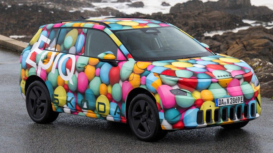 von 4: Auch wenn die Tarnfolie das Design noch verbirgt, ist klar, wofür der Skoda Epiq steht. Für ein unaufgeregt funktionales und bezahlbares Elektroauto, das seinen Weg machen dürfte.