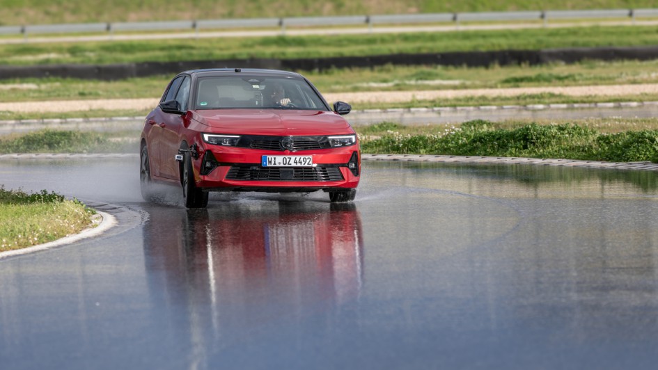 von 24: Beim Nasshandling (Foto) ist deutlich weniger Wasser auf der Strecke als beim Aquaplaning-Test, da pendelt sich die Wassertiefe auf 7 Millimeter ein. Auf Autobahnen sind reichen ab Tempo 100 bereits 3 Millimeter, um das Fahrzeug – je nach Bereifung – aufschwimmen zu lassen.