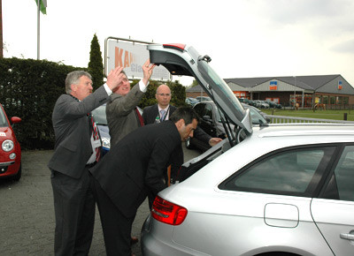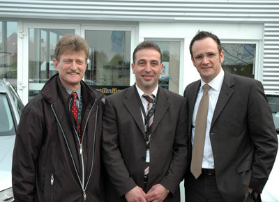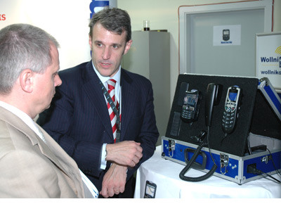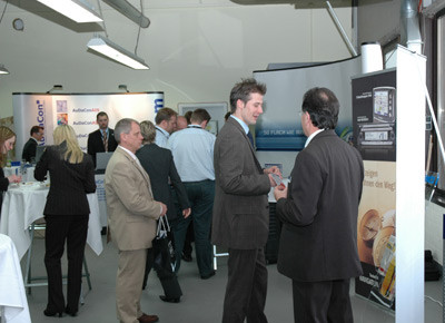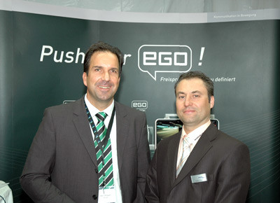 von 12: Matthias Striegel (Arval) und Volker Varol (WollniKom) vor dem Messestand von Funkwerk Dabendorf. Mit im Gepäck: die neue Bluetooth-Komplettlösung EGO DRIVE von Funkwerk Dabendorf.