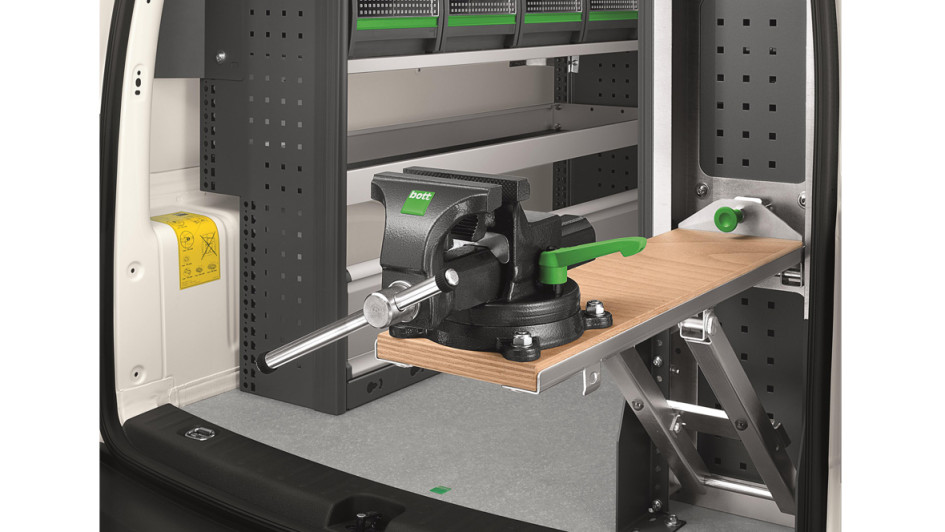 von 4: Für besondere Anforderungen bestimmter Gewerke können zusätzliche Optionen, wie ein weiteres Regal auf der Beifahrerseite oder auch ein Schraubstock mitbestellt werden.