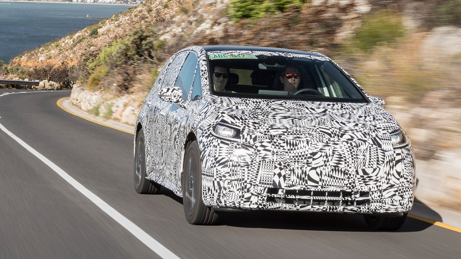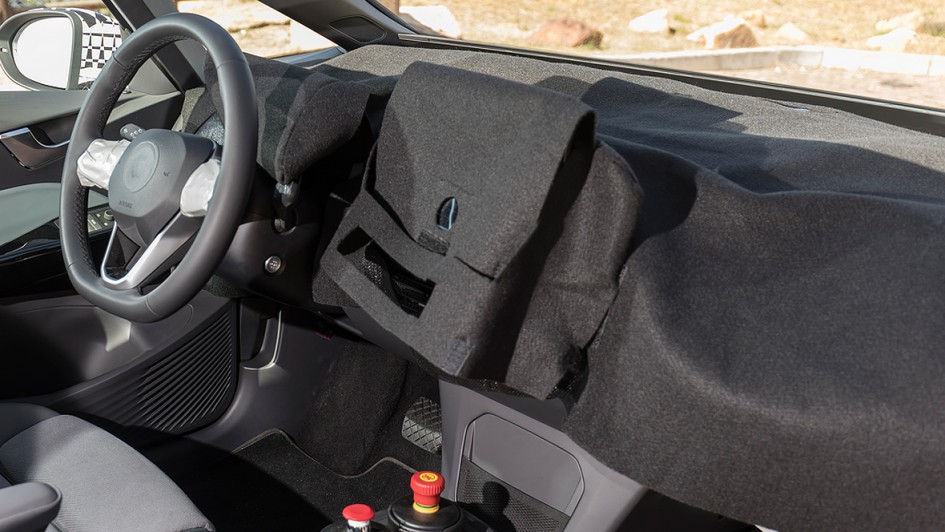 von 8: Noch ist das Cockpit getarnt. Statt des üblichen Layouts mit großem Bildschirm unter einer breiten Hutze gibt es nur noch ein kleines Display, das frei hinter dem Lenkrad steht und daneben einen um so größeren Touchscreen.