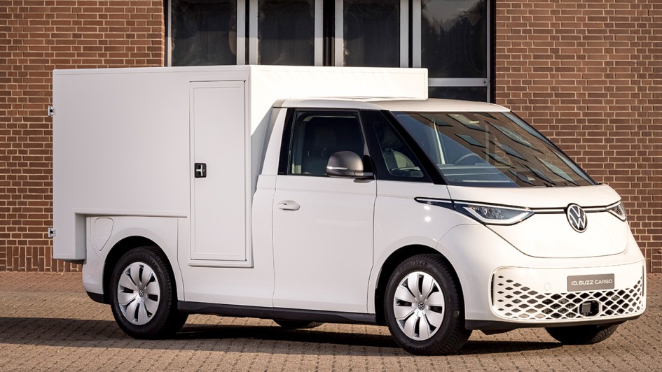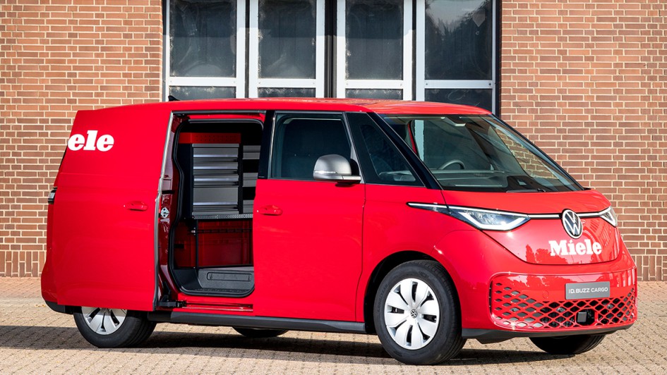 von 6: Auf dem Stand von Volkswagen Nutzfahrzeuge ist auch ein Servicewagen von Miele in auffälligem Rot und Regalausbau zu sehen. Der Gütersloher Hausgerätekonzern ist eines der ersten Unternehmen, das den ID Buzz im Kundendienst einsetzt.