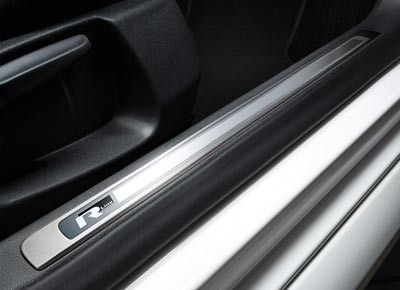 von 7: Ein Sport-Lederlenkrad sowie Edelstahlelemente auf der Pedalerie und den vorderen Türeinstiegsleisten mit R-Line-Logo komplettieren die Ausstattung.