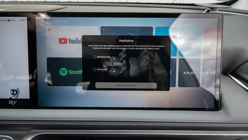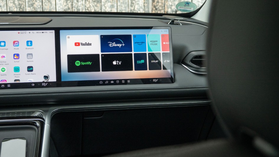 von 30: Der Beifahrer hat ein eigenes Display mit 14,96 Zoll Diagonale. Hier spielt sich nicht nur die Musik ab, hier sind auch allerlei Video-Streaming-Dienste integriert, Anmeldung erfolgt über das eigene Nutzerkonto.