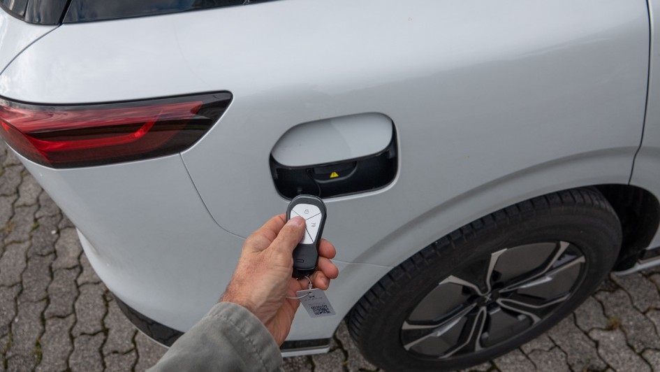 von 30: Die Ladeklappe öffnet auch auf Knopfdruck am Schlüssel. Um die Türen beim annähern entriegeln zu können, muss man umständlich in der App eine Freischaltung vornehmen – laut Xpeng aus Diebstahlschutzgründen.
