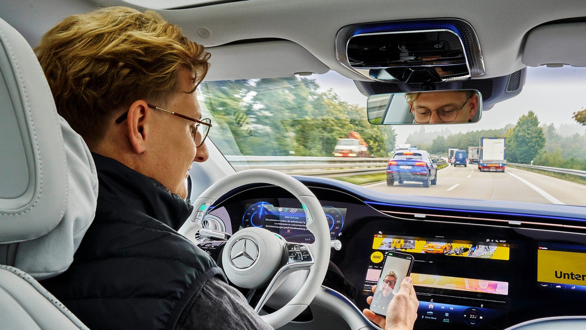 Etwas anders verhält es sich beim Drive Pilot von Mercedes-Benz, bei dem aber die Grundparameter vergleichbar sind: Das Fahrzeug hält auf der Autobahn die Spur und den Abstand, benötigt aber zwingend ein vorausfahrendes Fahrzeug, um sich zu orientieren. Schneller als 95 km/h erlaubt das System derzeit noch nicht, realistisch ist also, sich hinter einen Lkw einzusortieren und diesen zu verfolgen. Bei dem System des Levels 3 ist eine Fremdbeschäftigung möglich: Der Fahrer darf also zum Beispiel am Handy Nachrichten schreiben, er muss aber innerhalb kurzer Zeit bereit sein, das Steuer wieder zu übernehmen.