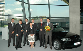Karl-Heinz Kral, Geschäftsführer von Alphabet, und Christel Reynaerts, General Manager of Alphabet International Sales & Key Account Management, überreichten den 143 PS starken BMW 118d an Roland Winklhofer von Kühne + Nagel. Der schwarze Jubilar verfügt unter anderem über Navi, Klimaautomatik und Handyvorbereitung.