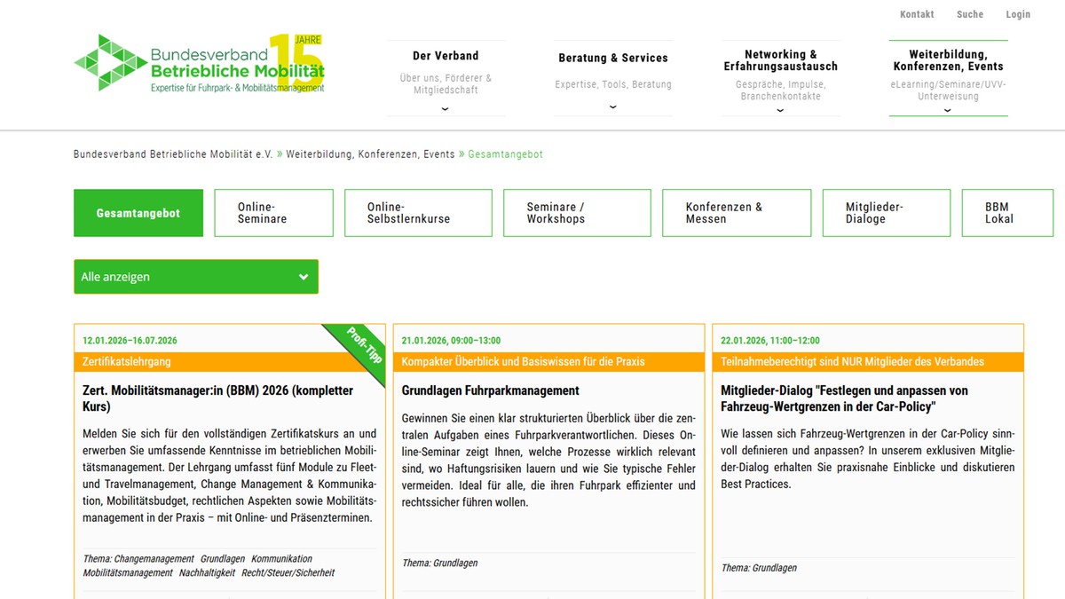 Der Bundesverband Betriebliche Mobilität hat sein neues Qualifizierungsprogramm für das Jahr 2026 veröffentlicht. Mit einem breiten Spektrum an Online-Seminaren, Präsenz-Workshops sowie themenspezifischen Zertifikatslehrgängen bietet der BBM ein praxisnahes Angebot für Mobilitätsverantwortliche.