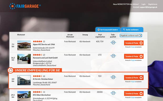 Das Fairgarage-Basispaket beinhaltet die Teilnahme an dem Portal inklusive der Werkstatt-Erfassungsmatrix für gewünschte Fahrzeugmodelle, Reparaturarten, individuelle Stundenverrechnungssätze sowie Teileaufpreis- und -abschläge. Pro vermitteltem Werkstattauftrag fallen ferner 9,50 Euro an. "Wir werden den Betrieben keine Teile von dem Umsatz wegnehmen, den sie über die Vermittlung von Werkstattaufträgen durch Fairgarage erzielen", betonte Nietzschmann. Fixe Transaktionspreise würden Klarheit schaffen und ein faires Geschäft ermöglichen.